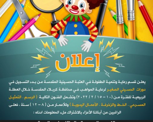 اعلان يعلن قسم رعاية وتنمية الطفولة في العتبة الحسينية المقدسة عن بدء التسجيل في دورات الحسيني الصغير لرعاية المواهب في محافظة كربلاء المقدسة خلال العطلة الربيعية للفترة من (10 – 15 / 2 / 2022) وتشمل الفنون التالية ( الرسم ، التمثيل المسرحي ،الخط والزخرفة, الاعمال اليدوية )...