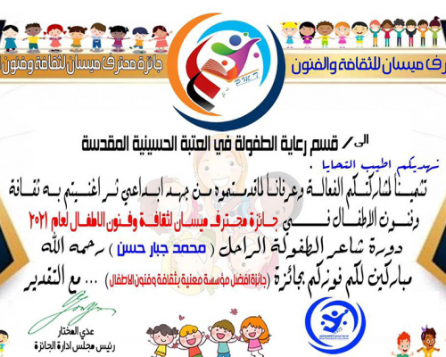 حصل قسم رعاية وتنمية الطفولة في العتبة الحسينية المقدسة، على أربع جوائز في مسابقة محترف ميسان لثقافة وفنون الاطفال (2021) (دورة شاعر الطفولة الراحل محمد جبار حسن). وقال رئيس القسم محمد الحسناوي في حديث للموقع الرسمي، إن "قسمنا كان له حضورا مميزا في مسابقة محترف ميسان...