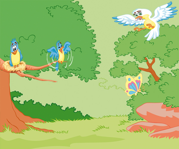 خرجت العصفورة الأم من العش لتجلب الطعام لصغيرها وقبل خروجها أوصت صغيرها بأن لايتحرك من مكانه حتى لا يقع من العش فيموت وبعد ذهابها بقليل جاءت فراشة وسلمت عليه وسألته لماذا تجلس وحدك هنا ؟ تعال لنلعب معا فقال لها لا أريد..أمي لا توافق فسألته فراشة ثانية ولماذا تتركك أمك؟...