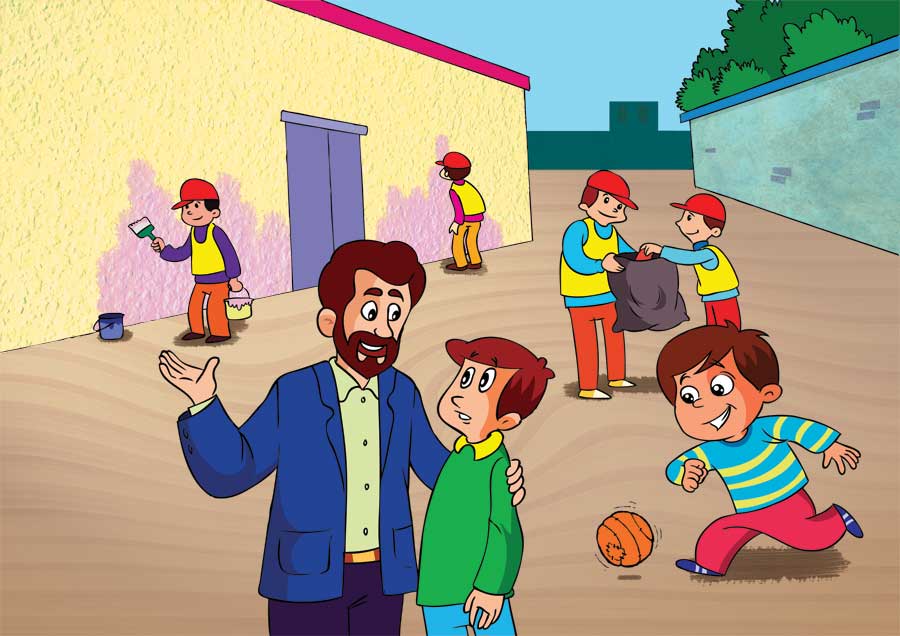 بينما هم يمرحون ويلعبون ونحن ننظف المكان ونعتني به فقال معلم الرياضة لا عليكم نحن