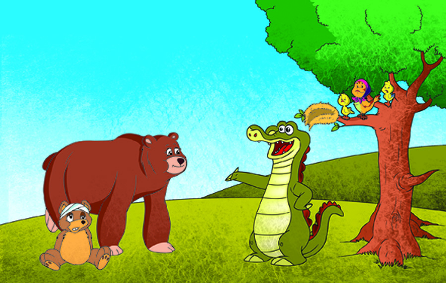 وارتطم رأسه بالصخرة وقد لاحظ هذا الأمر التمساح الذي كان يتبعه فهرع التمساح لمساعدة الدب لأنه أوشك على الغرق من شدة اصطدامه بالصخرة وبالفعل ساعد التمساح الدب وسحبه إلى جرف النهر وكان الدب فاقداً للوعي فقالت له العصفورة إنه مسكين لقد فقد الوعي وكاد أن يغرق فقال لها التمساح هذا جزاء من يفعل الشر لقد أراد هذا الدب إخافة أفراخكِ وإسقاطهم من الشجرة فوقع منها وحدث له ما حدث وفي هذه الأثناء استيقظ الدب ورأى التمساح في وجهه فظن بأن التمساح يريد أكله فهرع إلى أمِهِ صارخا وباكيا يطلب النجدة منها , وبعد مدة قصيرة جاء الدب مع والدته فقالت والدته لماذا يا صديقنا التمساح تريد أن تأكل طفلي الصغير ؟ روى التمساح لها القصة بالكامل وما كان منها إلا أن تقول لابنها عليك بالإعتذار منهم جميعاً وأن تساعد العصفورة في بناء العش الذي هدمته أو تواجه العقوبة التي تستحقها وأيضا تعدهم بأن لا تكرر مثل هكذا أمور لأننا هنا جميعنا نعيش بود ومحبة ولا يوجد بيننا من يزعجنا أو يؤذينا .