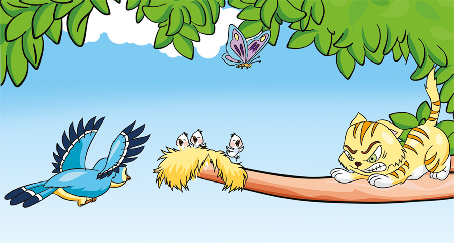 ولكن القط لم يكتفِ بهذا الفعل بل تسلق إلى أعلى الشجرة وذهب إلى عش العصفور وقام بتحريك الغصن بقوة يريد إسقاط الفراخ من العش فانقضت عليه العصفورة وأخذت تضربه يميناً وشمالاً مدافعة عن صغارها فأسرع القط بالفرار وهو مذعور وخائف .