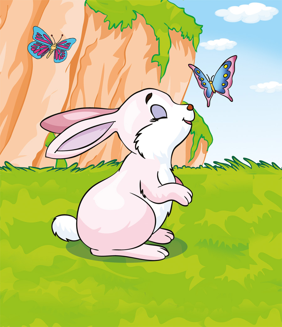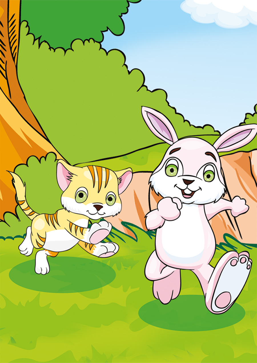وذات يوم رأى القط الأرنب وهو يلعب ويقفز بين الحشائش فقال القط : هذه فرصتي لكي أنفذ خطتي التي رسمتها , فقام القط بوضع مصيدة كبيرة في الطريق وغطاها بالحشائش وكانت العصفورة تراقبه من أعلى الشجرة , فذهب القط إلى الأرنب وطلب منه أن يتسابقا فقال له الأرنب : لك ذلك , وبدأ السباق وعند منتصف الطريق وأثناء جريهم قام القط بتخفيف سرعته وترك الأرنب يسبقه, فشاهد الأرنب المصيدة وهي مغطاة فقفز عالياً وهو يعمل حركات بهلوانية .